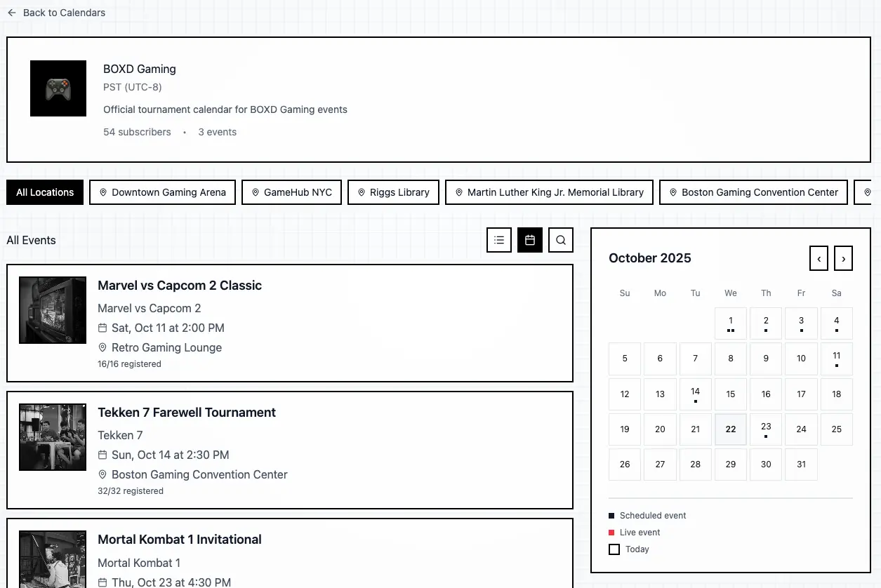 Events are automatically discoverable in your local area. Players can browse by game, date, or location to find tournaments and meetups near them.